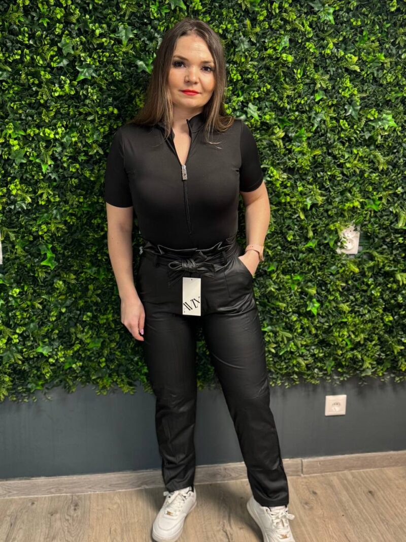 Modern és trendi műbőr nadrág, amely tökéletes választás a hétköznapi elegancia és a divatos megjelenés kedvelőinek. Az egyenes szárú fazon kényelmes viseletet biztosít, míg a derékrészen található öv és masni nőies és stílusos kiegészítője az összképnek.